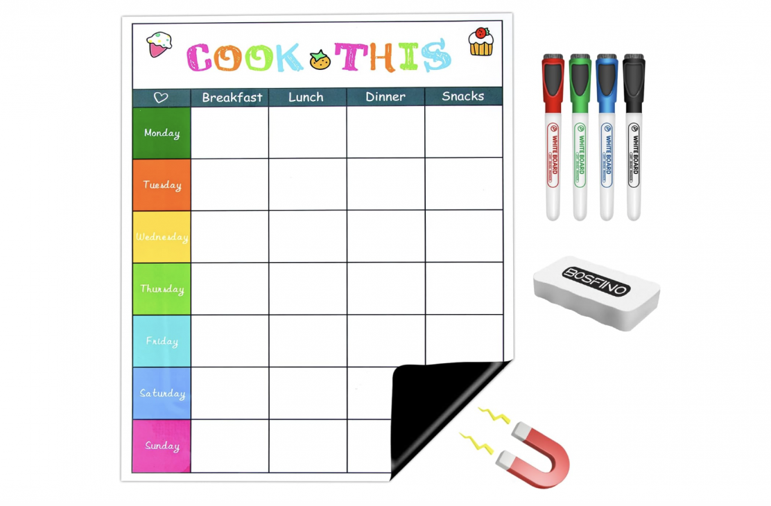 Meal times can be a struggle in our house. Given the choice, my son would eat pasta with pesto for every meal, so sitting down on a Sunday and planning a slightly more varied menu has become a really important part of our week. We then stick this on the fridge so we can all check what’s on the menu. As my husband and I share responsibility for cooking, it makes everything much easier during busy periods.
