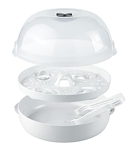 Convenience and speed are big pros of microwave sterilisers, but on the downside they are very small and only hold a couple of bottles at best. They’re often designed to hold a specific brand of bottle – and you won’t know which brand of bottle your baby likes (if any!) until they arrive.