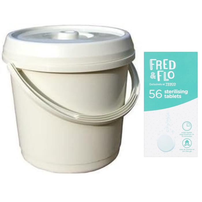 You can use any bucket you want, or even sterilise in a clean sink. Milton sells a special bucket with a compressor and locking lid that I really like, but here I’ve just included a basic lidded bucket. You need to change the water and use a new tablet every day, so to sterilise for 12 months, you’ll need to budget for at least 7 boxes of tablets.